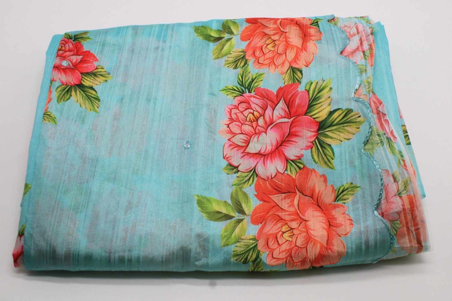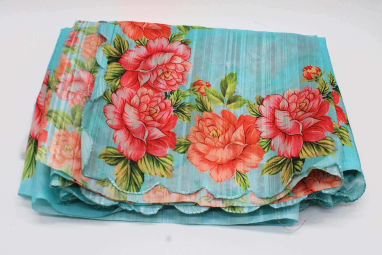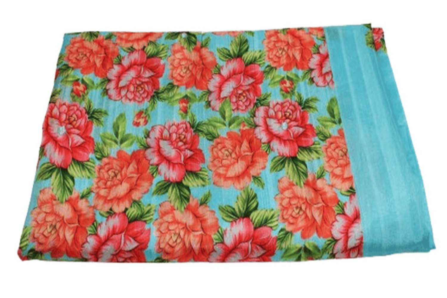 Large, bold flowers in shades of red, coral, and peach with green leaves — arranged in a clustered floral pattern that adds vibrance and charm.