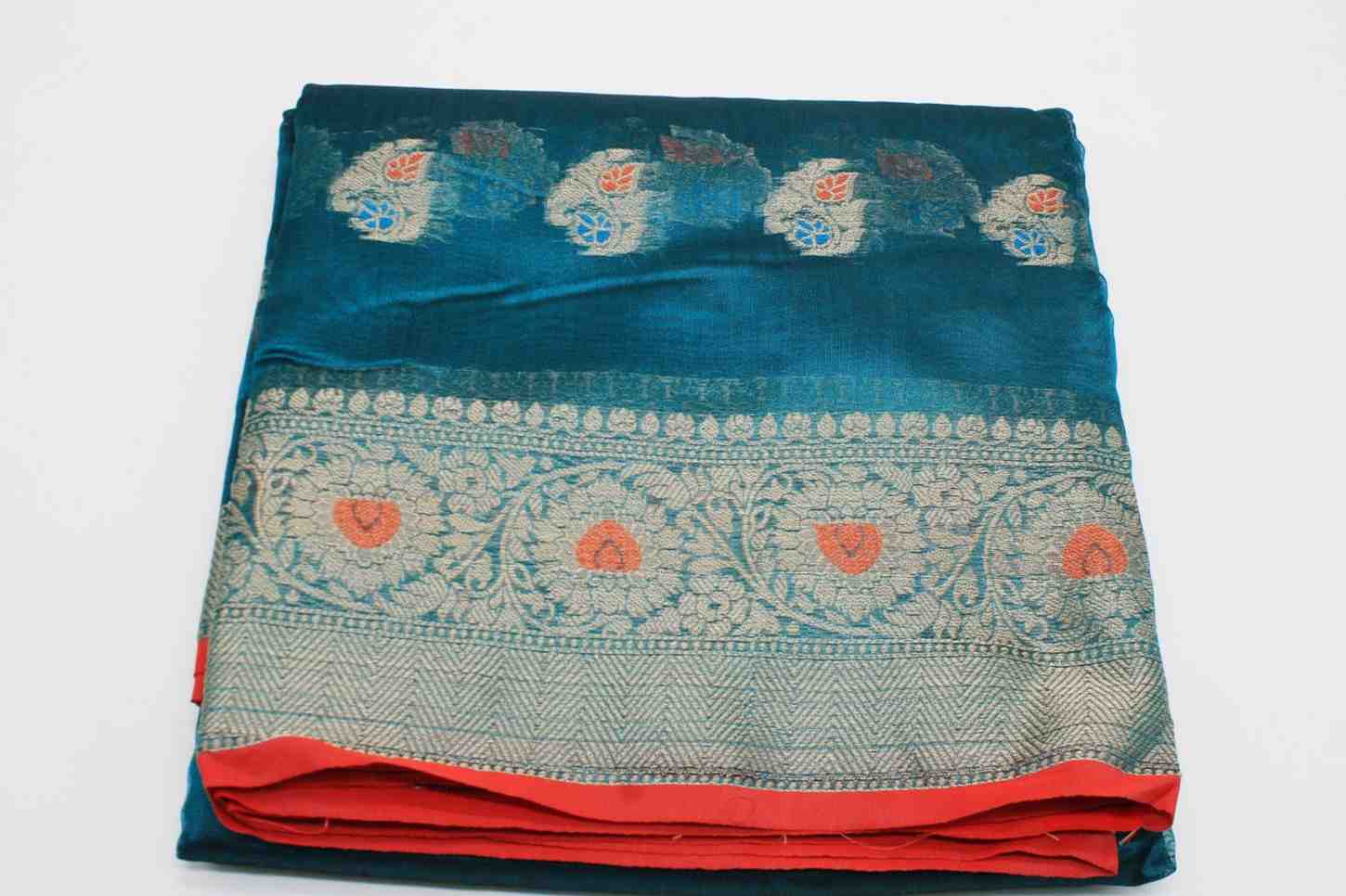 The rich fabric shines gracefully, making it perfect for weddings, festive occasions, and special celebrations. The saree comes with a contrasting red border and pallu, enhancing its luxurious appeal.