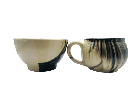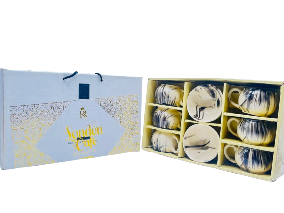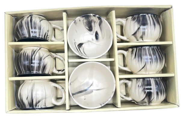 On the left side, the box is open, revealing 6 neatly arranged white ceramic cups and with 2 Bowl compartments for safe packaging.