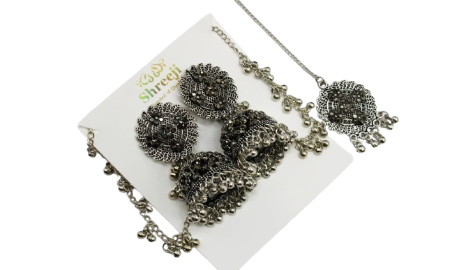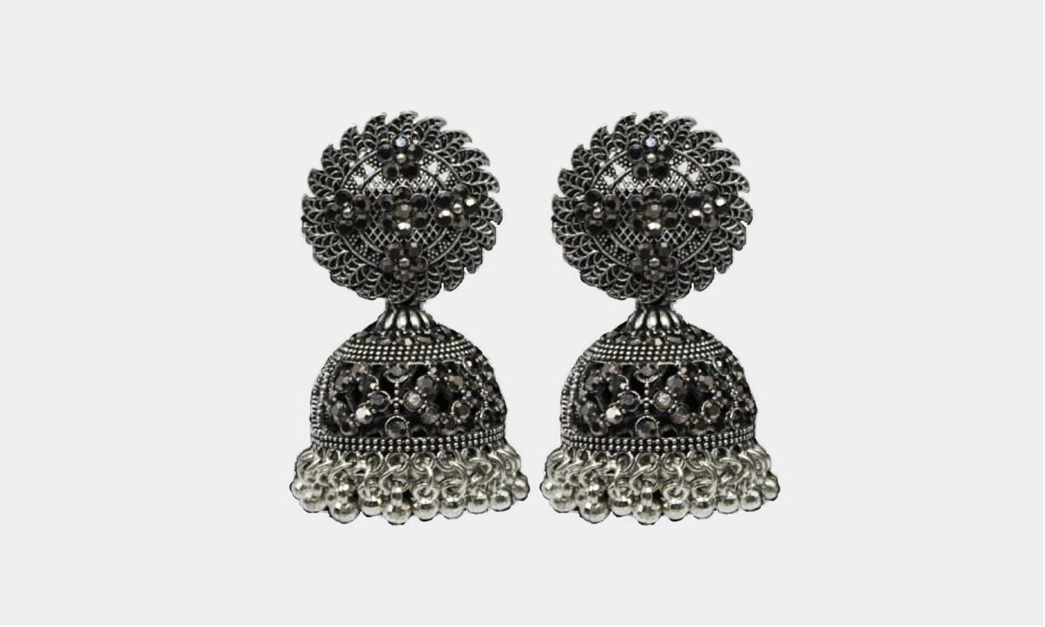 Crafted with precision, these jhumka earrings showcase a stunning oxidized silver finish, giving them a unique and fashionable edge.