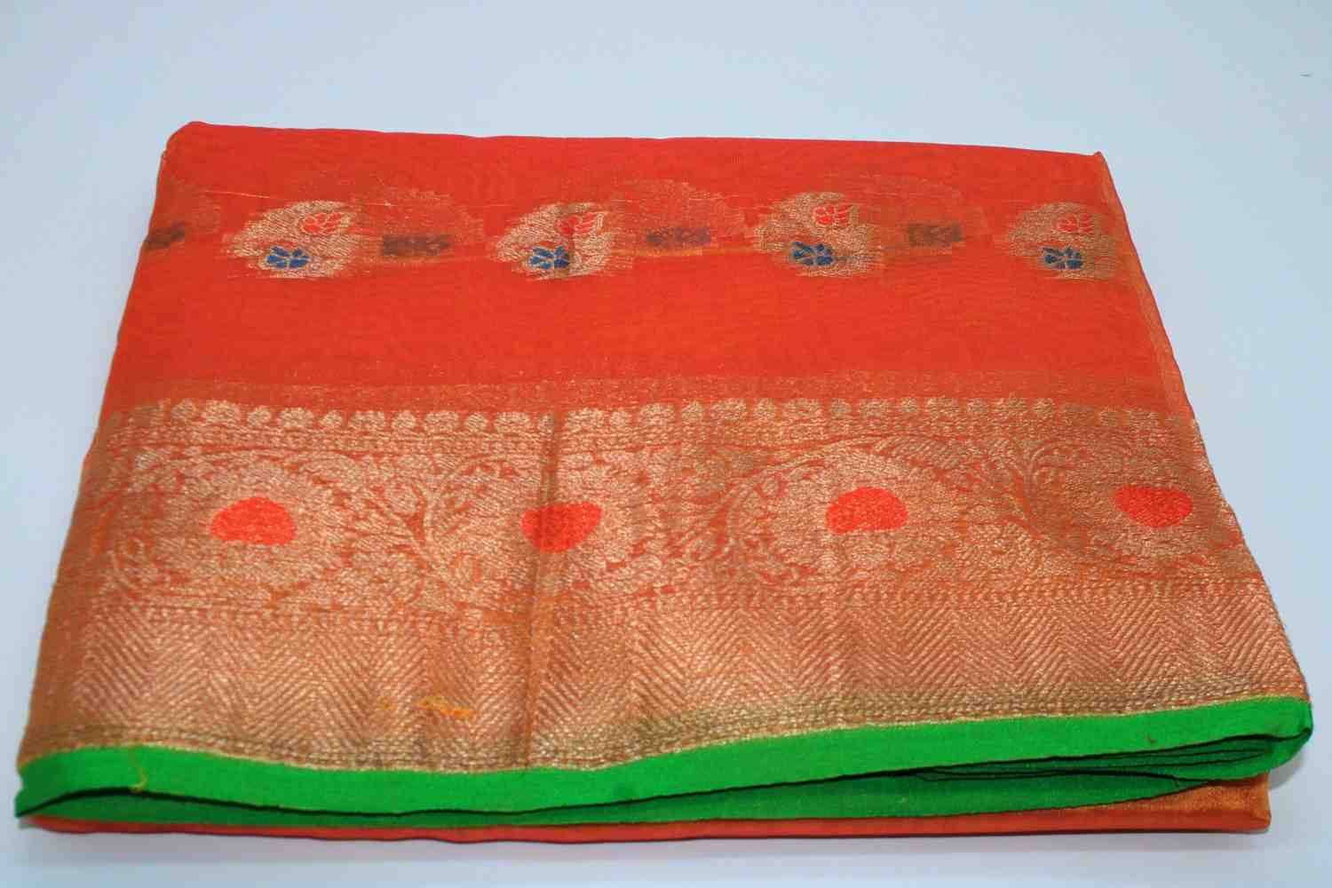 Bring elegance and tradition to your festive wardrobe with this orange silk saree featuring a green contrast border and beautifully woven golden zari motifs.