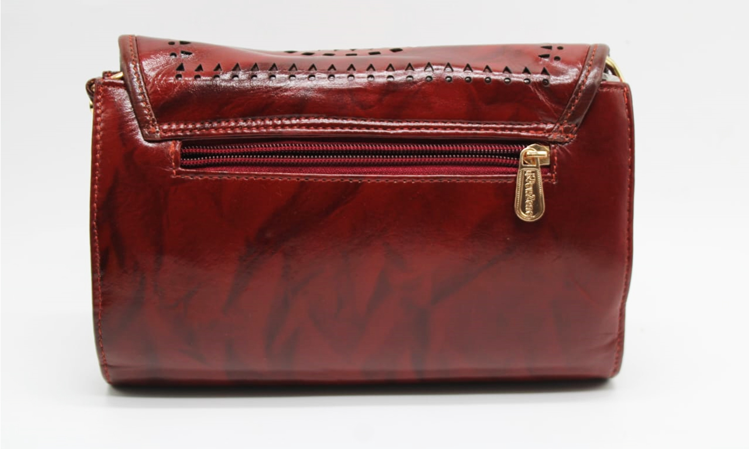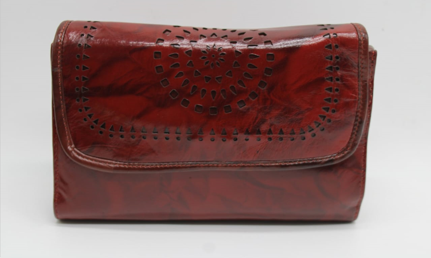 This is a stylish leather clutch bag in a deep reddish-brown shade. It has a flap closure with intricate laser-cut floral patterns on the front, adding a touch of elegance and uniqueness.