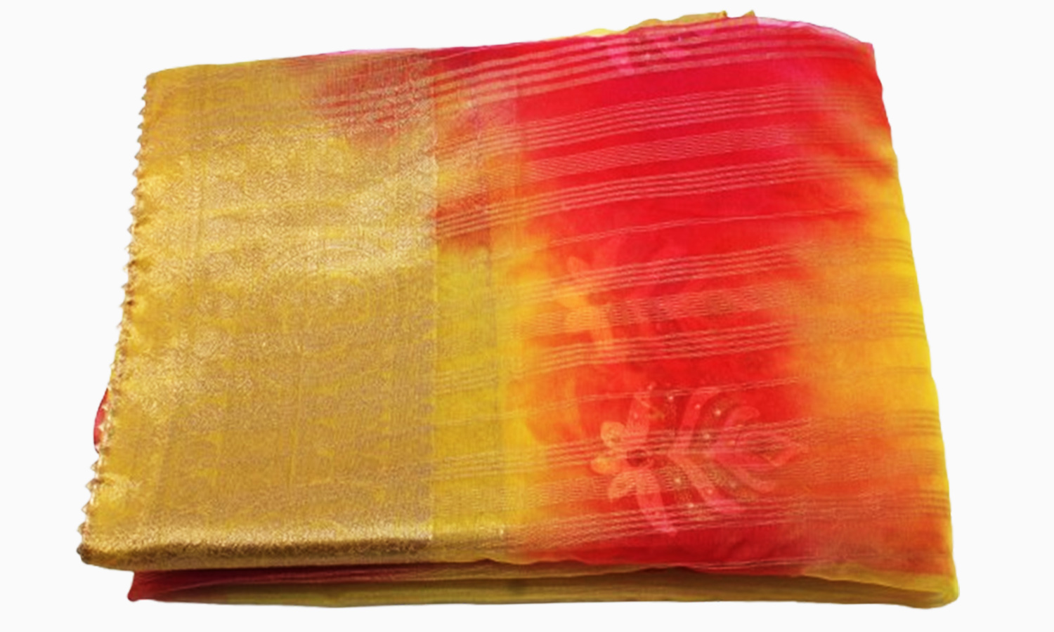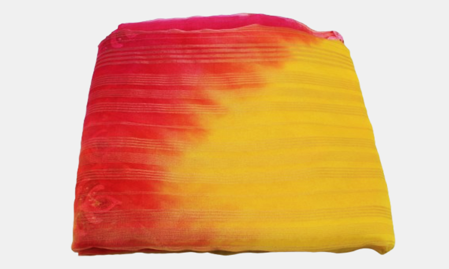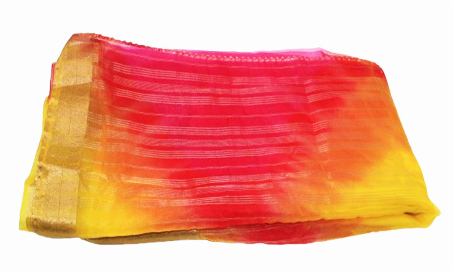 This is a vibrant traditional saree featuring a stunning blend of yellow, orange, and red shades, giving it a graceful ombre effect.