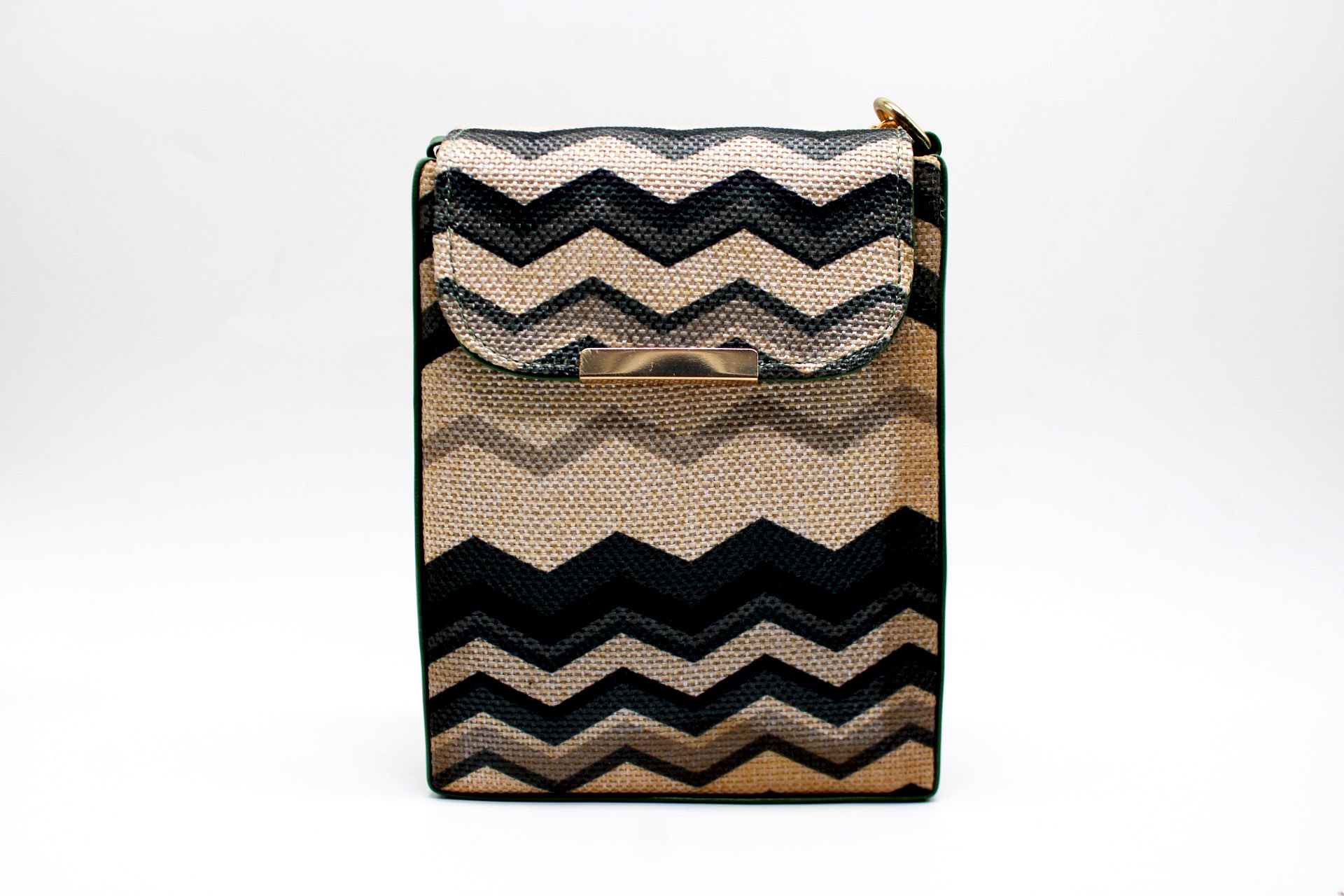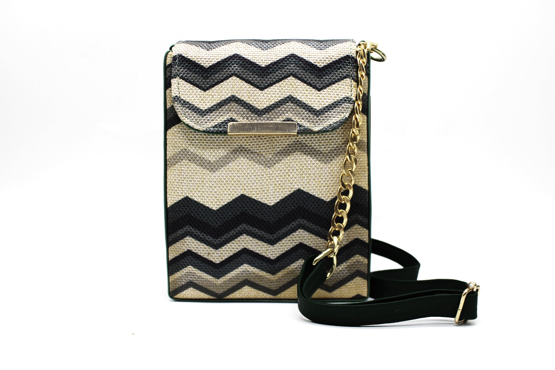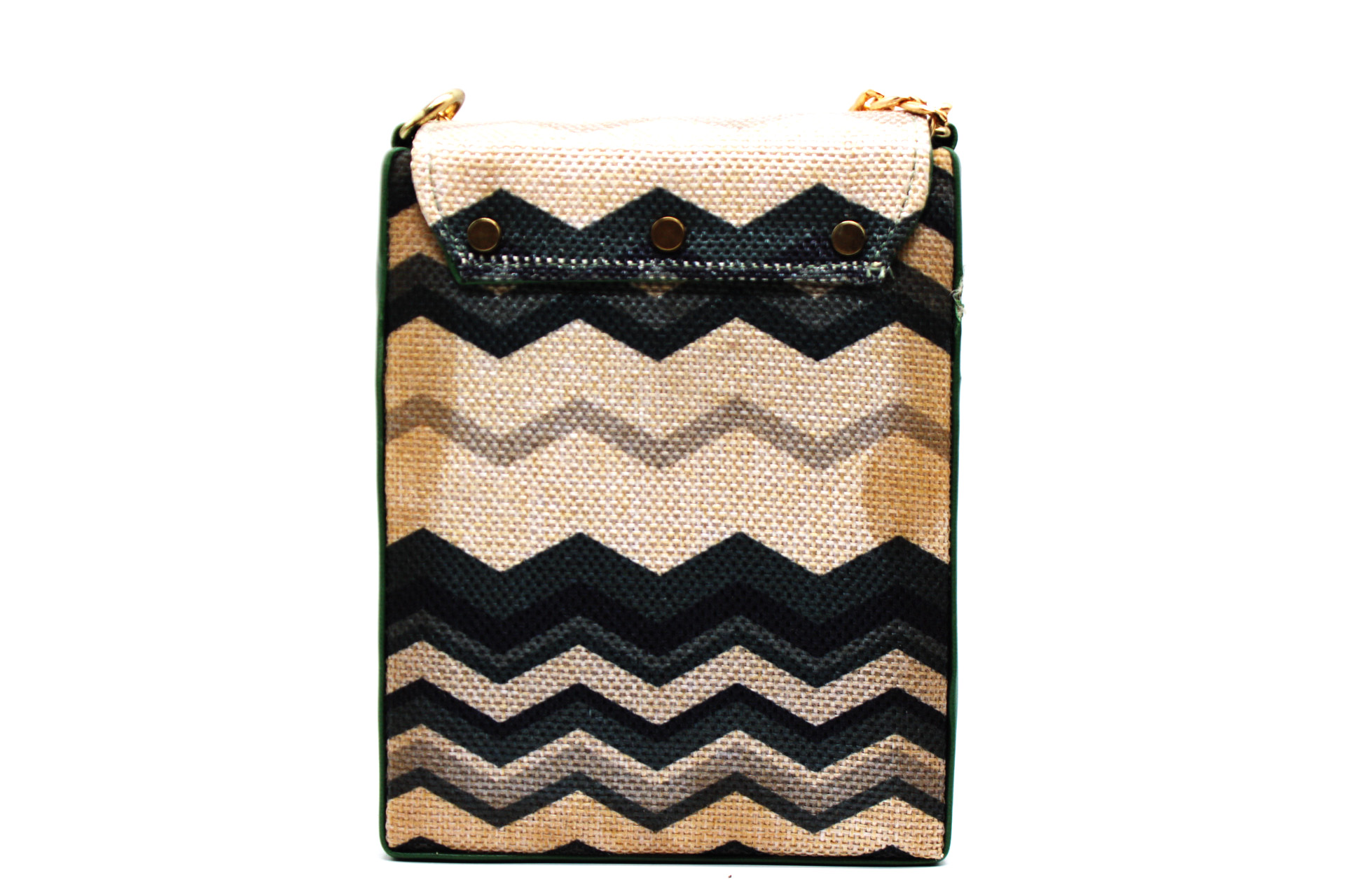This is a compact, rectangular crossbody or sling bag with a modern geometric design. The exterior features a textured beige background adorned with bold black and grey zigzag (chevron) patterns, giving it a stylish, contemporary look.