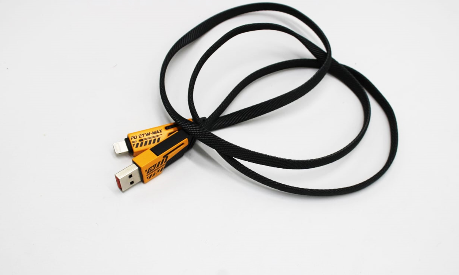 This is a durable USB charging and data transfer cable. One end features a standard USB-A connector, while the other end has a Lightning connector, making it suitable for Apple devices like iPhones, iPads, and iPods.