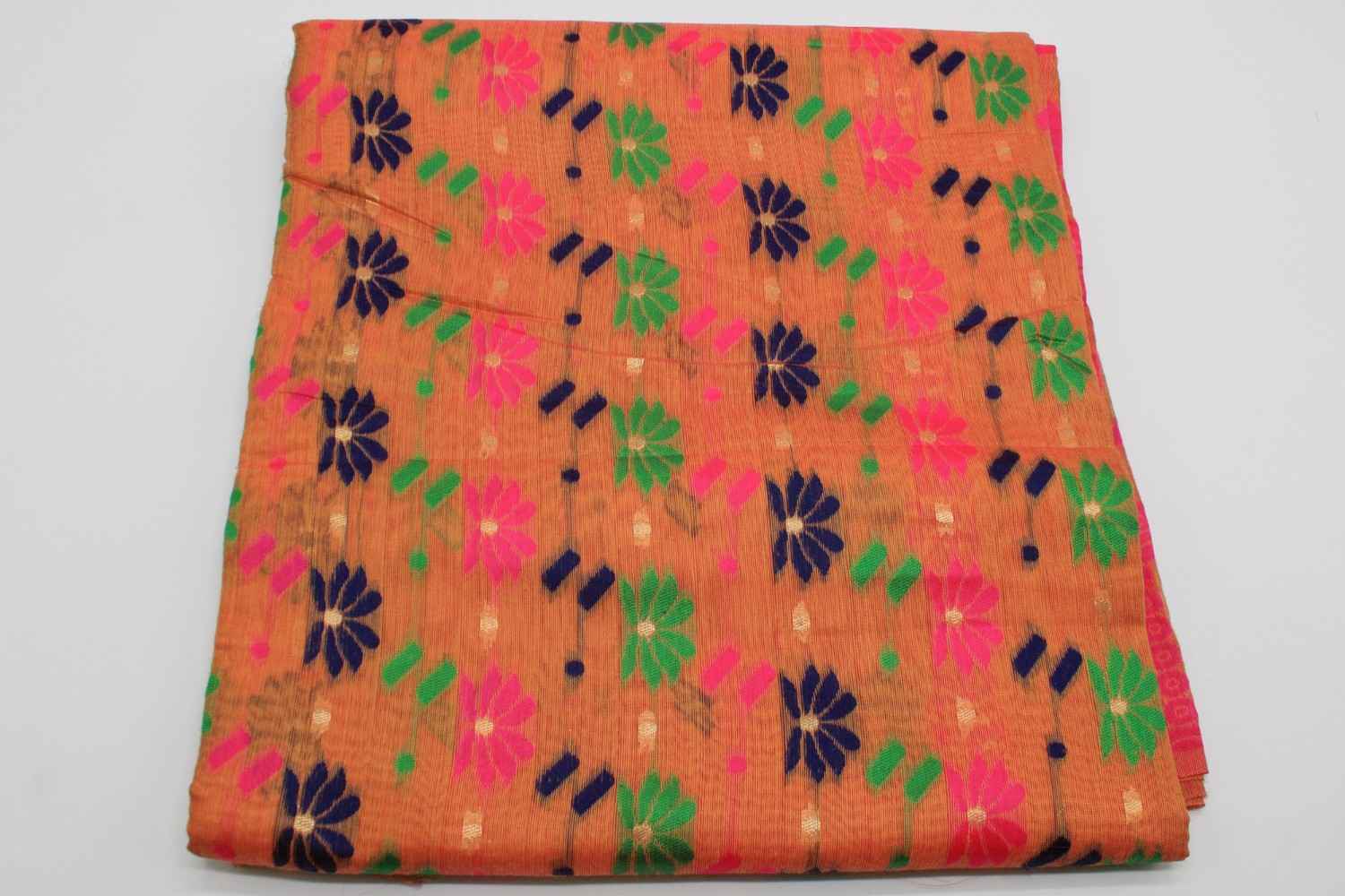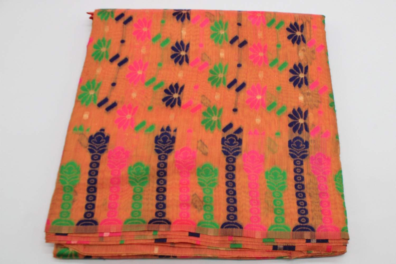 The fabric has a bright orange base, giving it a lively and festive appearance.