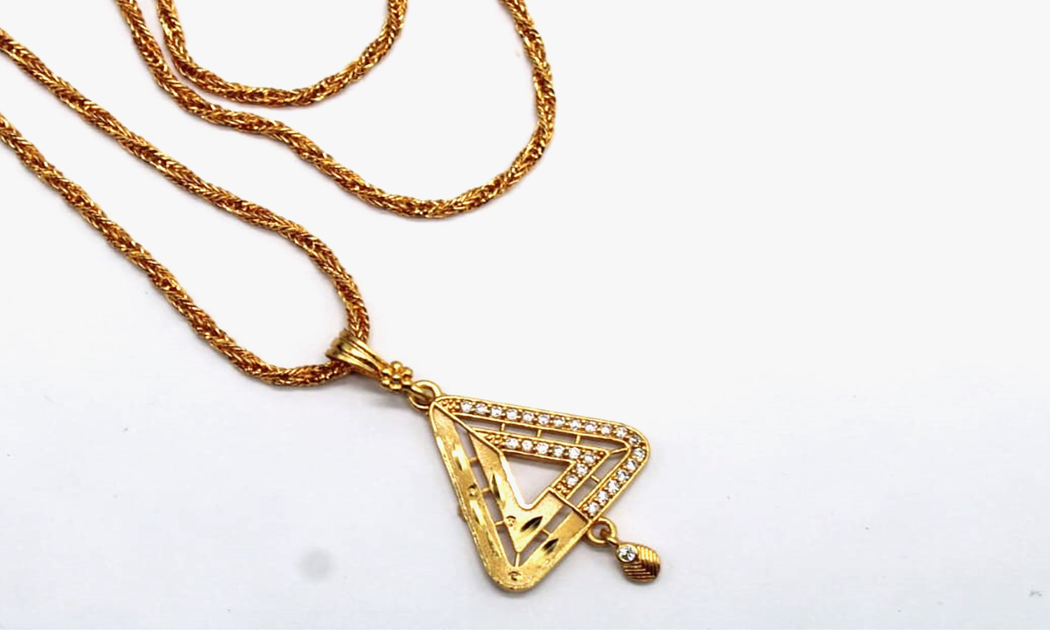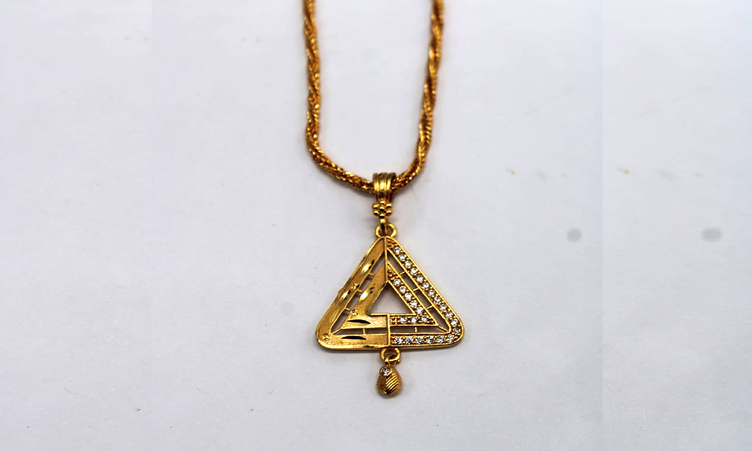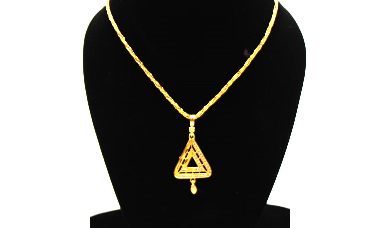 Twisted rope chain design, adding texture and durability. Elegant triangle-shaped pendant with a modern and artistic pattern.Glossy gold plating that gives a luxurious and timeless look.
